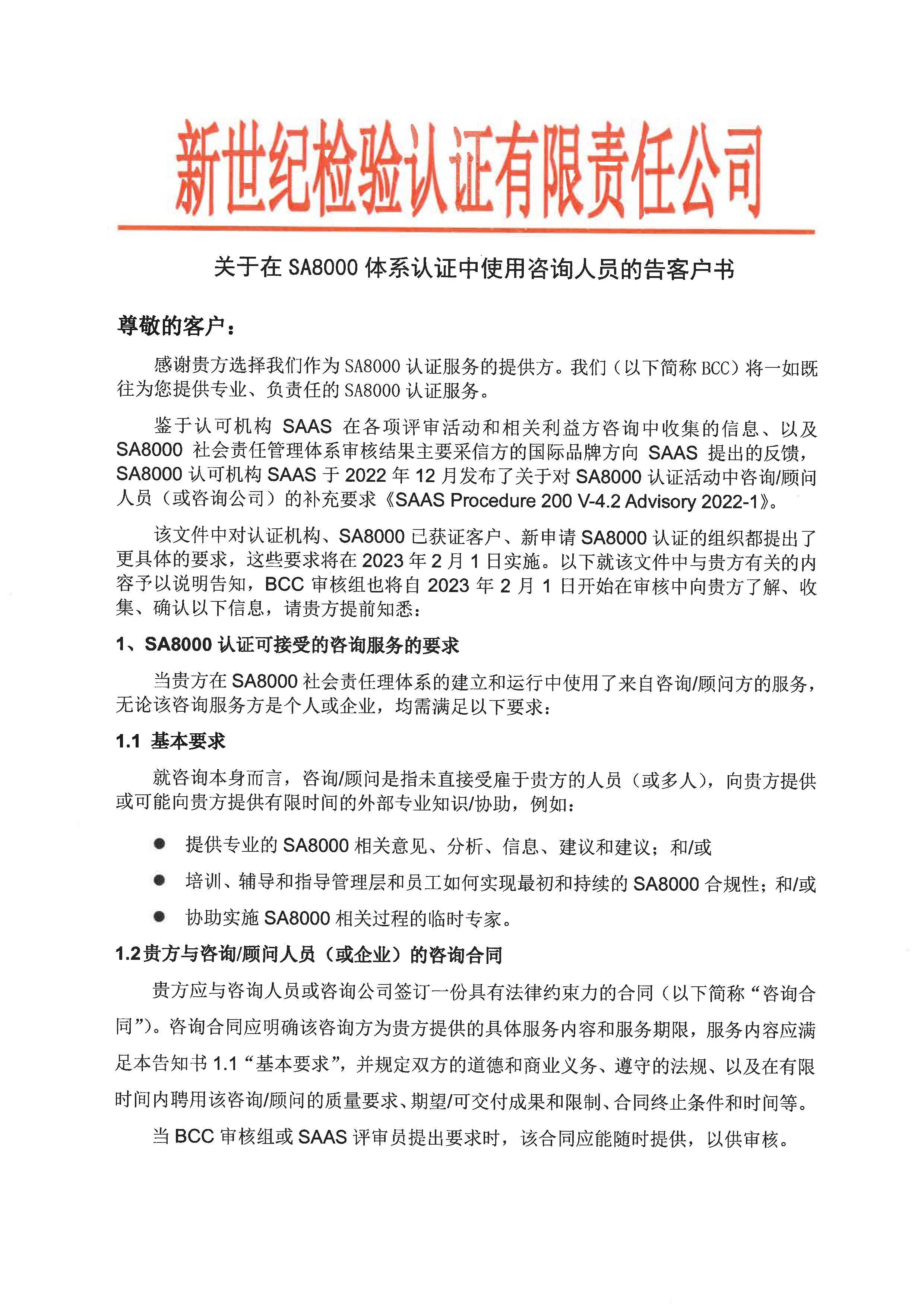 關(guān)于在SA8000體系認(rèn)證中使用咨詢?nèi)藛T的告客戶書(shū)