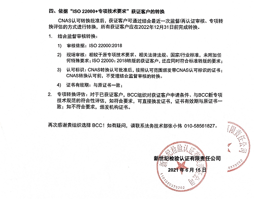 • 2021年7月1日(含)后通過(guò)認(rèn)證決定的,依據(jù)本告知書第四條款通過(guò)專項(xiàng)轉(zhuǎn)換評(píng)估后,經(jīng)評(píng)估符合要求的,頒發(fā)依據(jù)“ISO22000:2018”的認(rèn)證證書;經(jīng)評(píng)估不符合要求的,頒發(fā)BCC機(jī)構(gòu)證書;