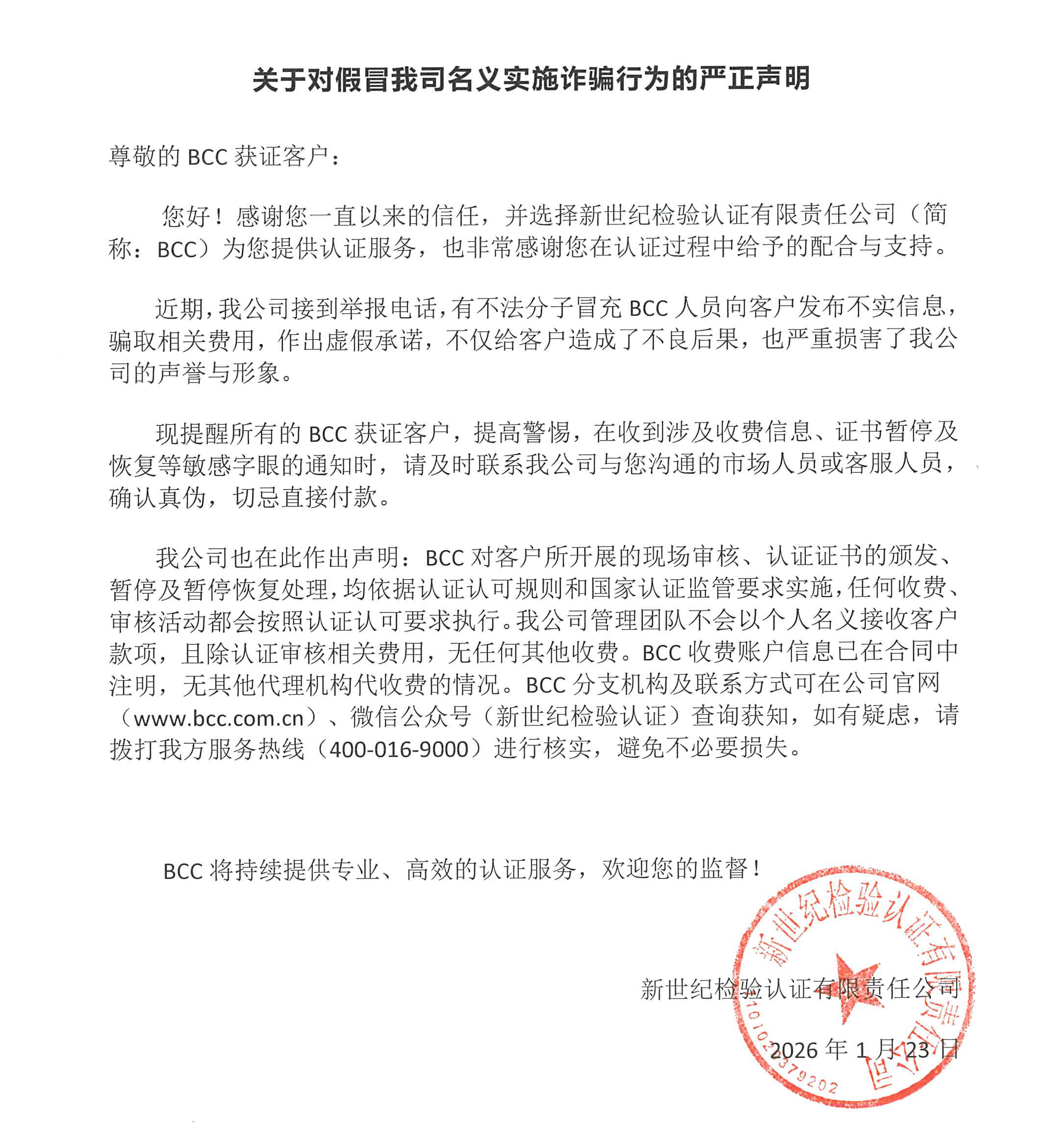 我公司也在此作出聲明:BCC對客戶所開展的現(xiàn)場審核、認(rèn)證證書的頒發(fā)、暫停及暫?;謴?fù)處理,均依據(jù)認(rèn)證認(rèn)可規(guī)則和國家認(rèn)證監(jiān)管要求實(shí)施,任何收費(fèi)、審核活動(dòng)都會(huì)按照認(rèn)證認(rèn)可要求執(zhí)行。我公司管理團(tuán)隊(duì)不會(huì)以個(gè)人名義接收客戶款項(xiàng),且除認(rèn)證審核相關(guān)費(fèi)用,無任何其他收費(fèi)。BCC收費(fèi)賬戶信息已在合同中注明,無其他代理機(jī)構(gòu)代收費(fèi)的情況。BCC分支機(jī)構(gòu)及聯(lián)系方式可在公司官網(wǎng)(m.cashdirectclub.com)、微信公眾號(hào)(新世紀(jì)檢驗(yàn)認(rèn)證)查詢獲知,如有疑慮,請撥打我方服務(wù)熱線(400-016-9000)進(jìn)行核實(shí),避免不必要損失。