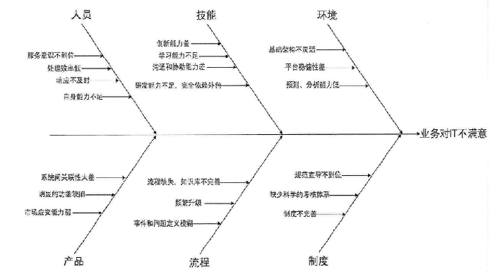 業(yè)務對IT服務不滿意的因素可以歸結在人、物、軟能力、外部環(huán)境、流程和規(guī)則制度六個方面。在對各種影響因素進行分析后,進一步尋找服務不滿的真正原因,繪制出魚骨圖。